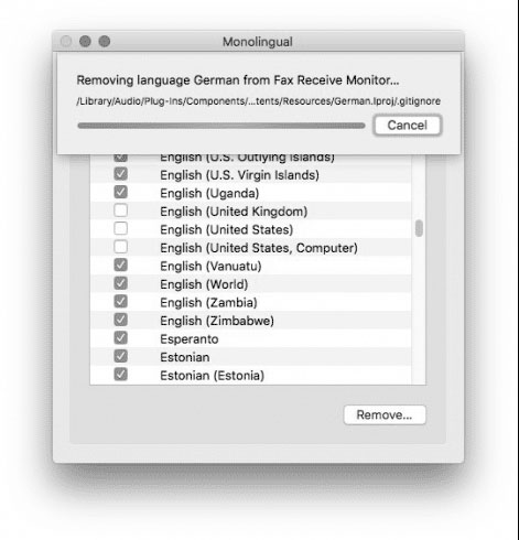 Monolingual for Mac is a program for removing unnecesary language resources from OS X, in order to reclaim several hundred megabytes of disk space. If you use your computer in only one (human) language, you may not need to be taking up space on your hard drive with extraneous localization files. Monolingual will locate and eliminate these space-wasting files.