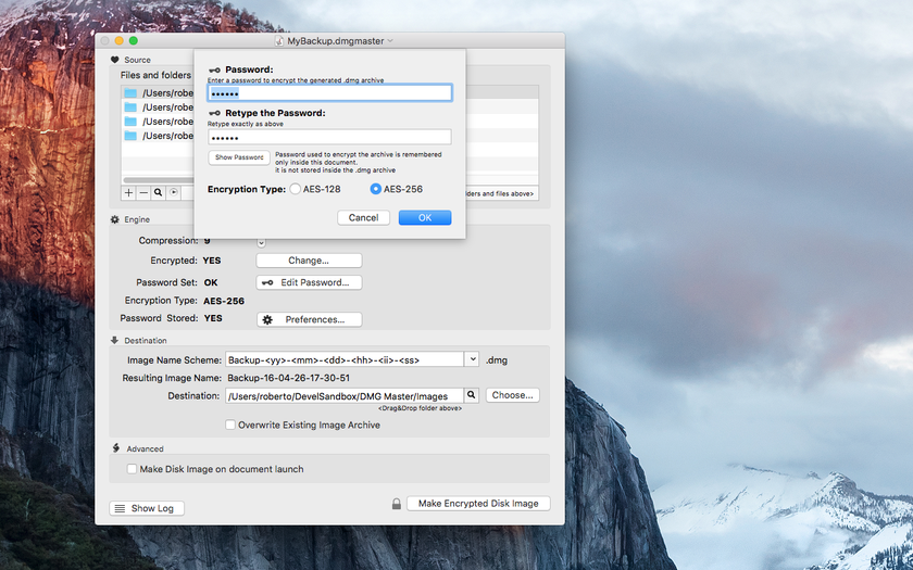 It uses, to create archives, a format universally recognized by any Mac. Clicking an archive, results in it be mounted by macOS as virtual disk on any Mac (no additional software required, no DMG Master required to mount it, it is enough to have macOS). The unique 'document based' approach used by DMG Master lets the user save a lot of time in the use of the software if compared with the classic 'utility' approach. Using DMG Master the user has to do that just one time and save all the settings in a document. After that, the user opens the document from disk and press the 'Make Disk Image' button. The disk image is created on the fly with the updated content. DMG Master can use a 'Make Disk at Opening' option to create backup archive without user interaction, using scripts or launcher utilities, simply opening DMG master documents. DMG Master can save archive also in encrypted format to make your data unavailable without the correct password. It uses the AES-128 or the AES-256 algorithm for encryption. Any user is able to read on Mac an encrypted DMG archive without additional tools just providing the correct password.