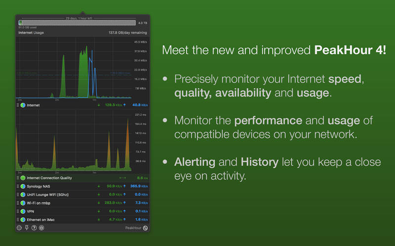 PeakHour for Mac is a beautiful, real-time network-traffic visualizer that lives in your menu bar. It provides an instant view of your Internet or WiFi activity in real-time. PeakHour is great for monitoring your Internet or WiFi connection, and can help you determine how much bandwidth your computers and devices are using at any given time.