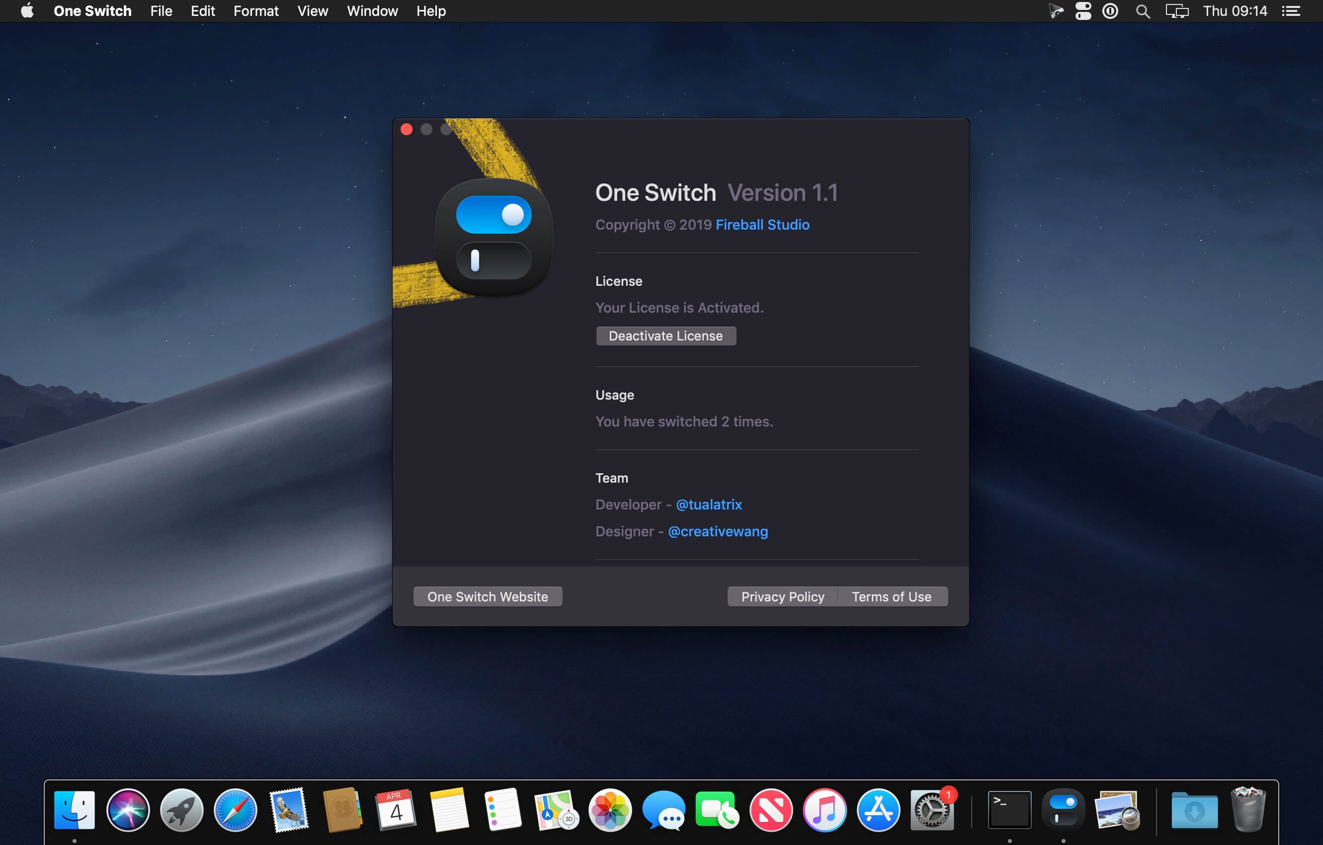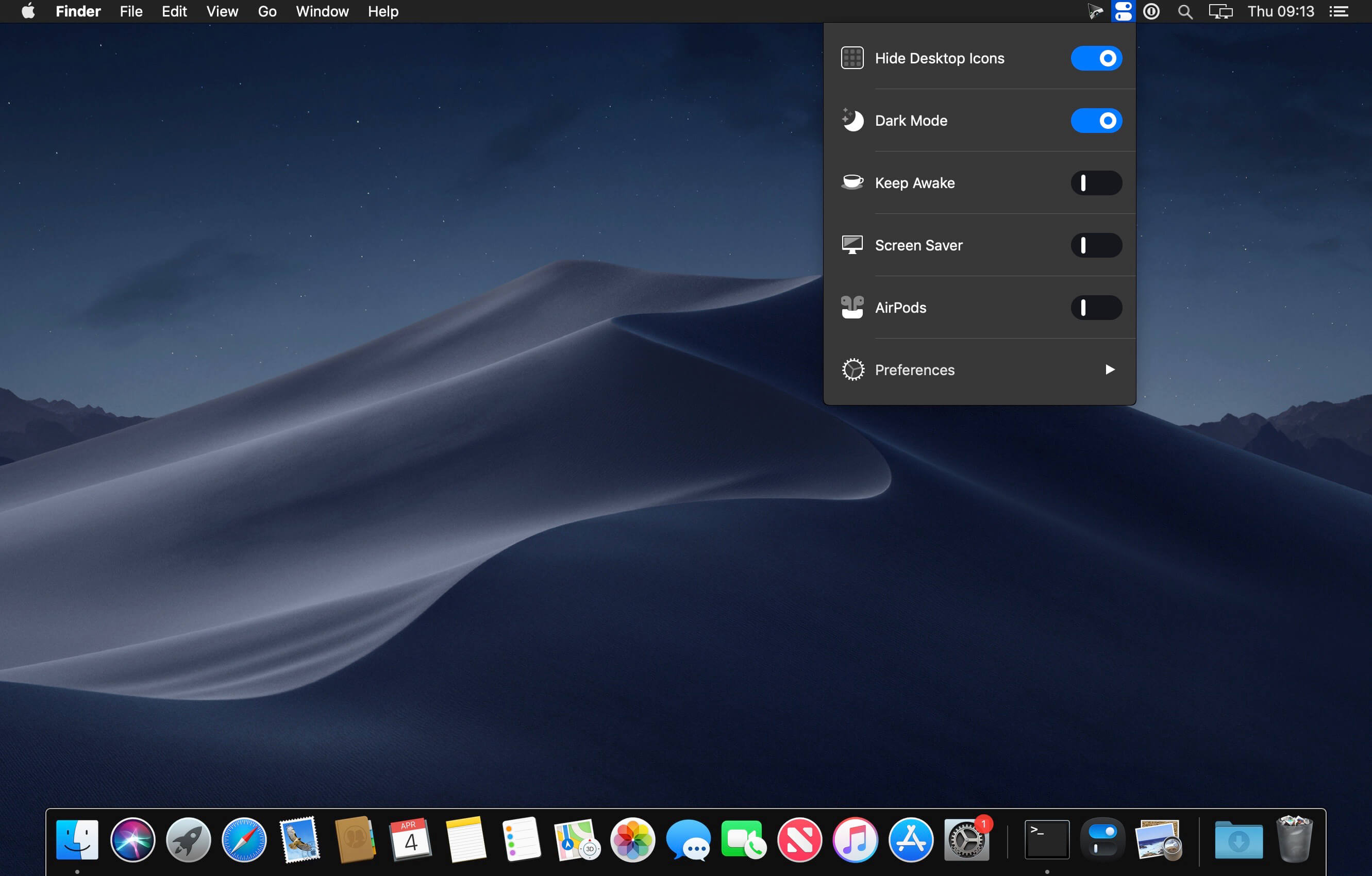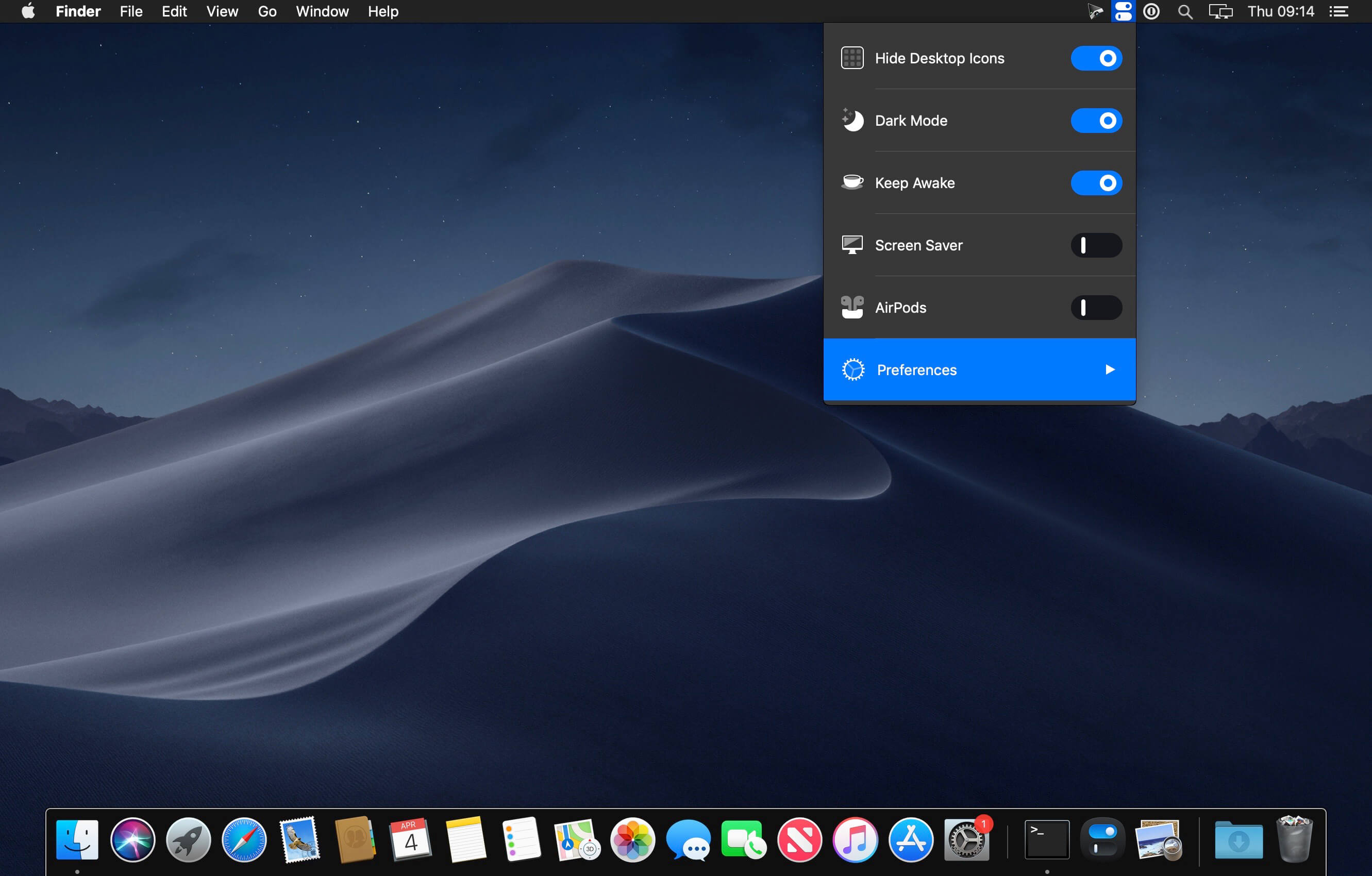 One Switch for Mac is a tiny app designed to improve your efficiency by providing quick access to a few important switches. It can be opened from your menu bar, and it allows you to toggle certain system features with just a couple of clicks.Hide Desktop IconsHide your messy desktop with one click.Dark ModeToggle Dark Mode at any time.Keep AwakePrevent your Mac from sleeping or displaying the screen saver.Screen SaverSometimes you will like to turn it on manually.AirPodsConnect AirPods with your Mac in just a second.