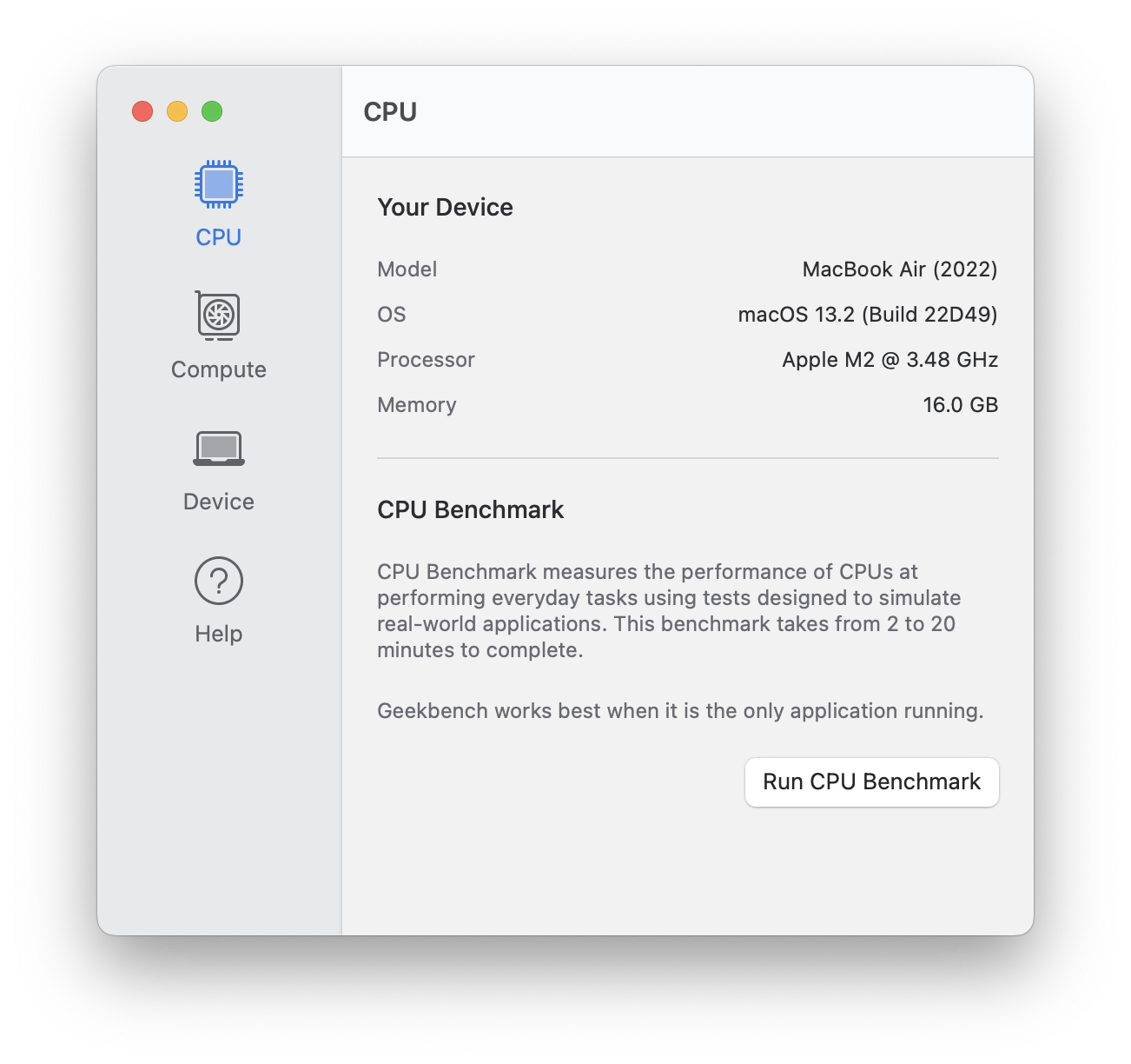 Geekbench 6 measures your processor's single-core and multi-core power, for everything from checking your email to taking a picture to playing music, or all of it at once. Geekbench 6's CPU benchmark measures performance in new application areas including Augmented Reality and Machine Learning, so you'll know how close your system is to the cutting-edge.