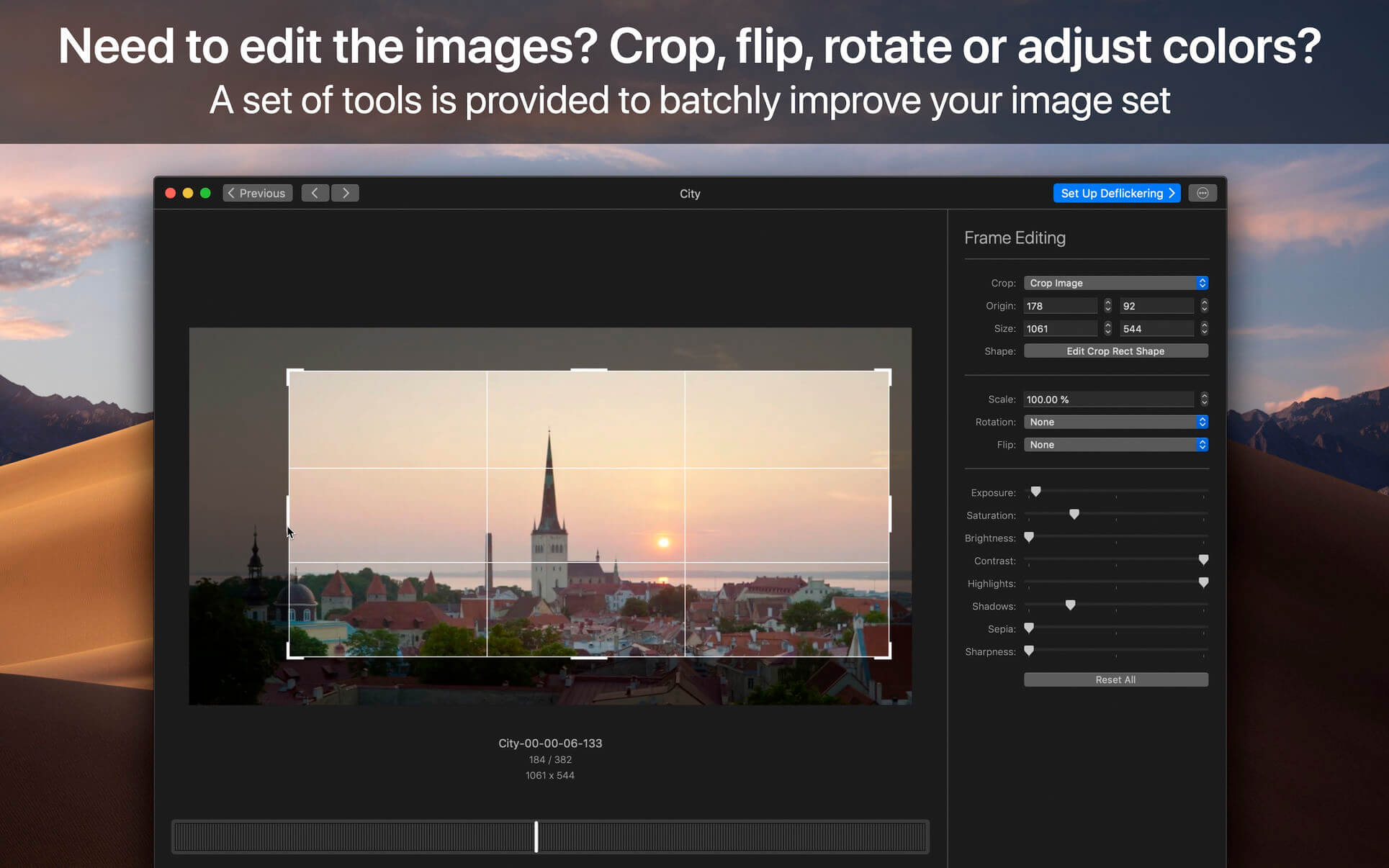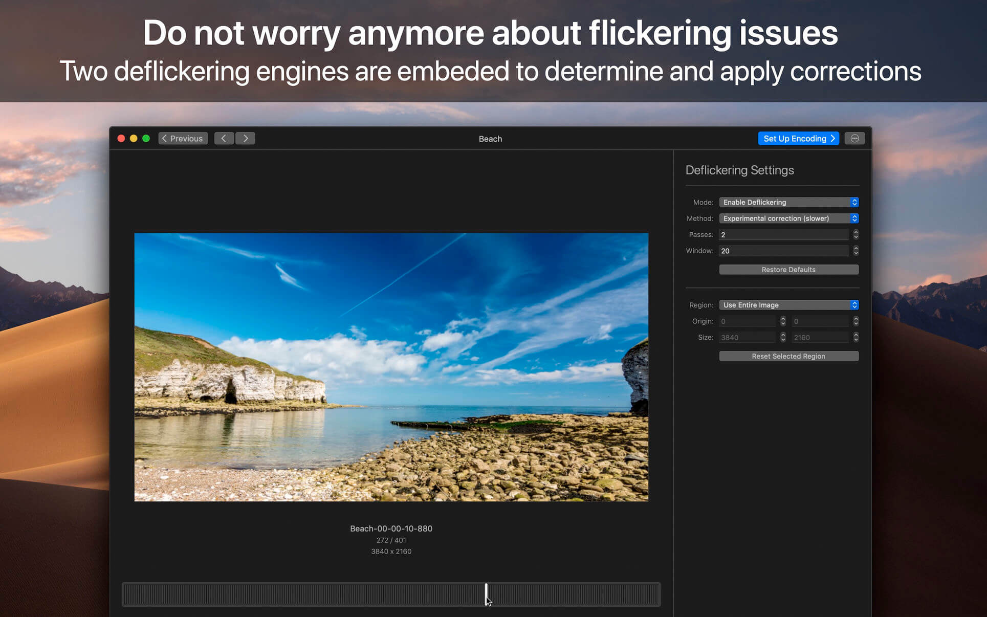 The application is designed for professional needs. That is why it can handle several hundreds of thousands of images painlessly. In addition, all industry-standard formats are supported. The application can import PNG, JPEG as well as all RAW image formats supported by macOS. The exported movie can be encoded in H.264, Apple ProRes as well as HEVC.
