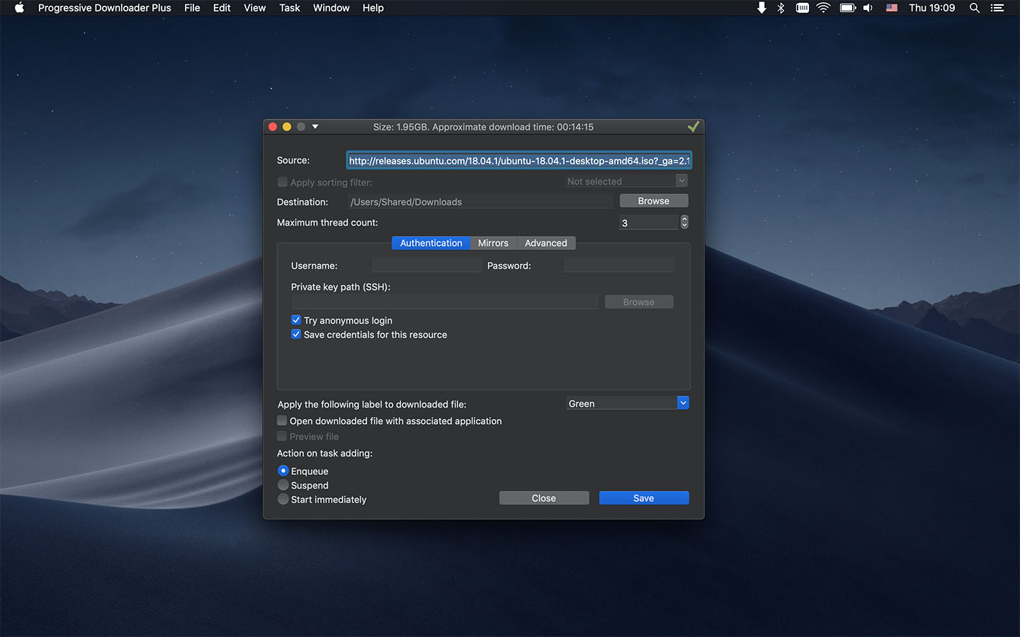 Progressive Downloader for Mac is a free download manager that supports multi-thread downloading and mirror search. Key features: HTTP(S), FTP, FTPS and SFTP(SSH) protocols support. Auto-resume downloads. Any interrupted download will be automatically resumed when your system wakes up or the application relaunches. Multi-thread downloads. Application downloads different parts of the file at the same time to make the downloading process faster. Queue manager. Control the order of your downloads by changing download priority. Mirror search. Automatic search for different locations of the same file to take the fastest one. Smart drag and drop. Drag and drop a part of text with hyperlinks on the application badge to download them. You can also do a similar operation with any text or html file. FTP, FTPS and SFTP browser. Browse and download files with double click or using drag and drop.