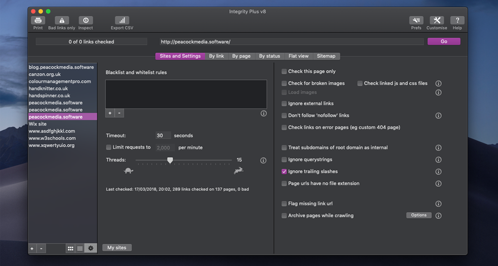 Integrity Plus for Mac fills the gap between Integrity, the free no-frills link checker, and Scrutiny, the webmaster tools suite. If you manage more than one site then Integrity Plus allows you to store settings for each site and switch between them. It generates a sitemap in xml and a variety of other formats. it also adds a search box and filter button to help you search your data.This versionĀ is faster and leaner. It also separates the engine from the UI so that the engine can be made available to other developers. Scans your site for broken links - as fast and accurate as Integrity All the features of the free Integrity Manage multiple sites Generate a sitemap in xml, dot and csv Good xml sitemap options, optionally include images and pdfs, add rules for setting update frequency and priority, or edit these manually Search your data Archive the pages while scanning with the option to convert them to a browsable archive OS X native, retina screen compatible.