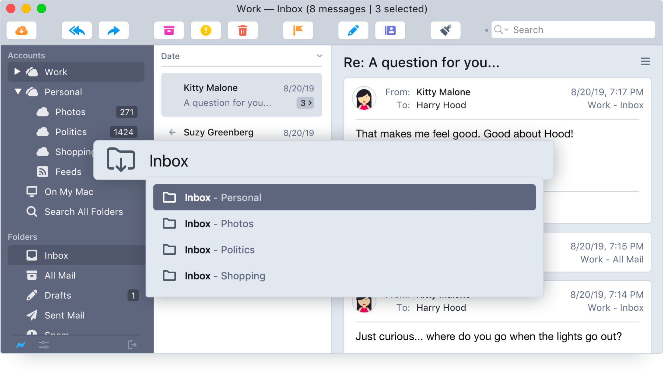Postbox is a desktop feature-stuffed email client, news application, and feed reader that helps you manage your work life and increase productivity. Now you can organize all your email accounts in one place, forward email content to hundreds of applications and services, enjoy fast search and a beautiful user interface design
