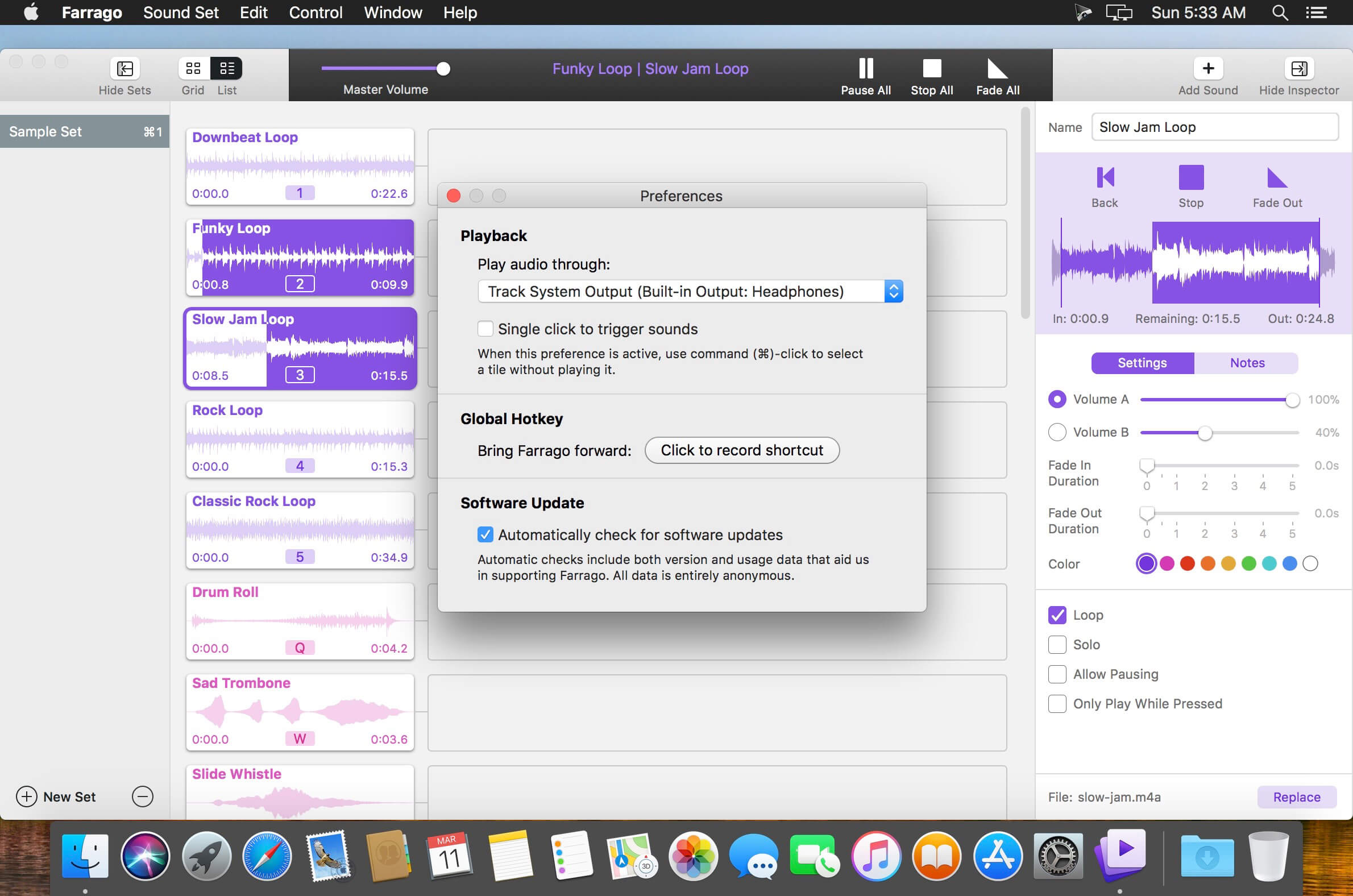 - Global Access via Hotkeys: With Farrago's user-definable Global Hotkey, you can pull the app forward, then use the in-app shortcuts to instantly trigger your desired audio.