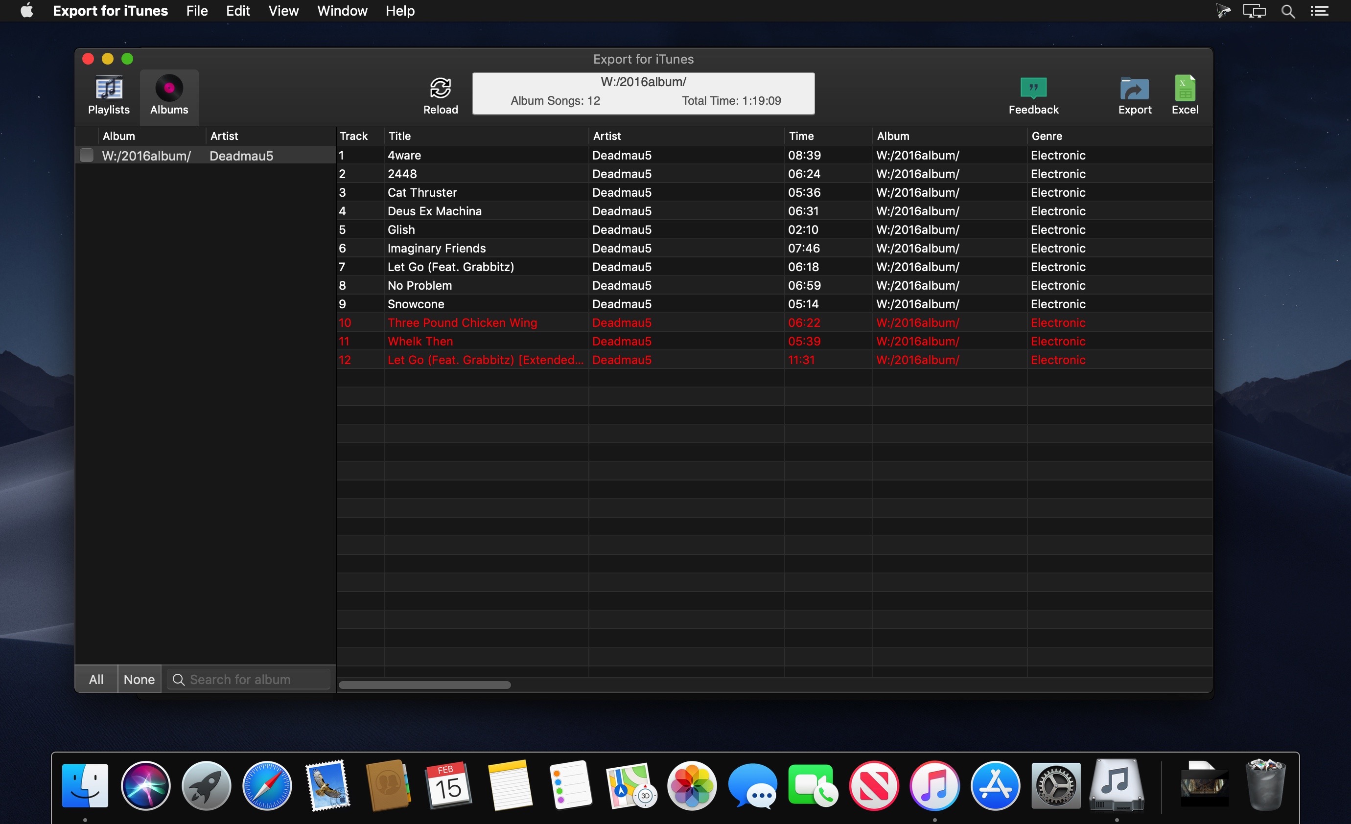 The app converts, copies and organizes your playlists' and albums' music files into folders, and creates the .m3u file that lets you play your playlist on any media player. For every album, you can include an image file with album artwork. You can browse and select which of your playlists or albums you want to export. See all playlist/album tracks with their metadata without opening the iTunes app. You can also export the track list from any album or playlist to Excel, so you can create a file with info about all your iTunes music. This iTunes export app let you preview and export metadata like: Title, Artist, Time, Album, Genre, File path, Kind, and Bitrate. The app does not modify your iTunes library.