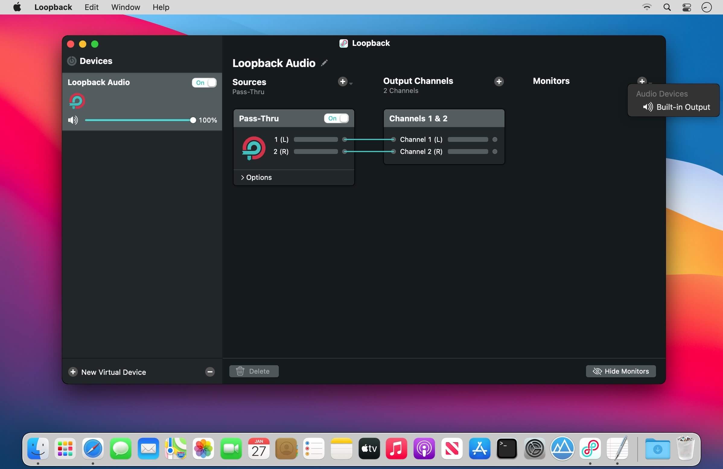 Loopback for Mac makes it easy to pass audio between applications on your Mac. Create virtual audio devices to take the sound from applications and audio input devices, then send it to audio processing applications. Loopback gives you the power of a high-end studio mixing board, right inside your computer! Play Audio to All Your Podcast Guests - Combine your mic with audio sources like iTunes or QuickTime Player, then select your Loopback device as your source in Skype. Presto! Your guests all hear both your voice and your audio add-ons. Record Gameplay Videos - Making gameplay videos with great audio can often be very difficult. If you're using a device like Elgato's Game Capture hardware and you want to record both your microphone and the game's audio at once, Loopback can assist! Combine Hardware Devices - Apps like GarageBand, Logic, and Ableton Live only record from a single audio device at once. Thankfully, they offer recording from many channels. With Loopback, you can combine multiple input devices into one virtual device for easy recording. Create Top-Notch Screencasts - Screen recorders, including QuickTime Player, allow you to include your mic's audio. Some allow recording of system audio instead, but neither option is ideal. Create a virtual device that grabs just the mic and the app’s audio to get exactly the audio you want. Route Audio For Broadcasts - Set a simple (pass-thru) device as the output at the end of an Audio Hijack chain, and then as the input source in Nicecast. Now listeners can tune in to a live stream of your podcast as you record it! Features Combine Audio Sources - Configuring a virtual audio device from multiple sources is easy. Just add the applications and physical audio devices you want to include to the Audio Sources table to get started. Available System-Wide - Your Mac will show Loopback's virtual devices exactly like physical devices. Find them listed among other devices in System Preferences or select them as an input or output in any audio app. Send Audio Between Apps - Loopback can also create pass-thru devices, which send audio from one app to another. Set the Loopback device as the output in one app and the input in another to make audio flow directly between the applications. Works With Any Application - Make a virtual audio device with audio from the applications on your Mac, including production apps like Logic or Reason, as well as simple audio players, like iTunes or QuickTime. Works With Any Input Device - Pull audio from the physical audio devices connected to your Mac. Whether you’ve got simple USB microphones, or high-end studio mixers, Loopback can access it all. Combine Apps and Physical Devices - Of course, you can create a virtual audio device that includes audio from both apps and physical audio devices. Multichannel Audio - Your virtual audio devices can be configured to have up to 32 channels, providing tremendous power. Custom Channel Mapping - By default, Loopback sets up channel mapping automatically. If you want to manually configure things, though, you’ve got powerful options! Nested Devices - You can now nest one Loopback device inside another, allowing for easier configuration, as well as even more power and control.