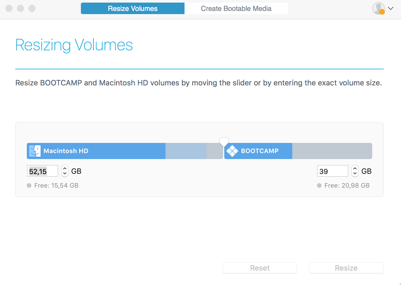 CampTune for Mac makes your Boot Camp Windows partition freely resizable. You may need to adjust the size of your Windows partition when, for example, you run out of disk space or want to install an application with particularly high storage requirements. CampTune provides a simple slider to redistribute storage space between Macintosh HD and Boot Camp Windows partitions. The resize operation is safe, fast and easy.