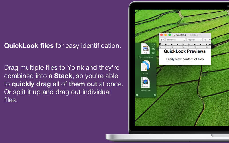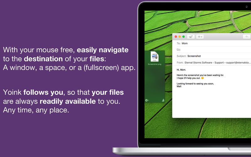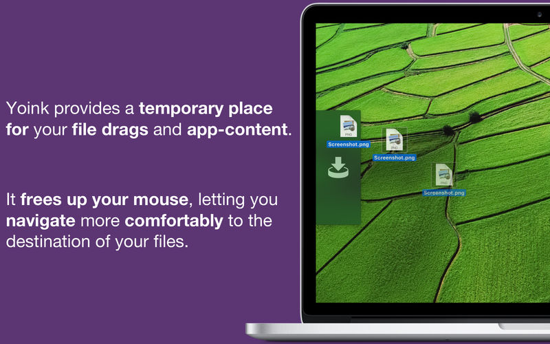 Every time you start dragging a file, Yoink fades in a tiny window on the left edge of your screen so you can drag files to it. This frees up your mouse so you can comfortably navigate to the destination of the drop and resume the drag from Yoink's window.