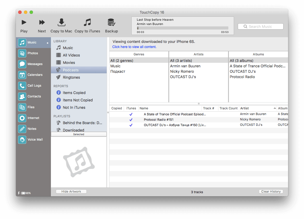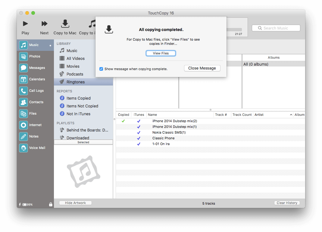 TouchCopy for Mac lets you copy your music, video, photos, text messages, and more from your iPod, iPhone, or iPad back onto your Mac or directly into iTunes.