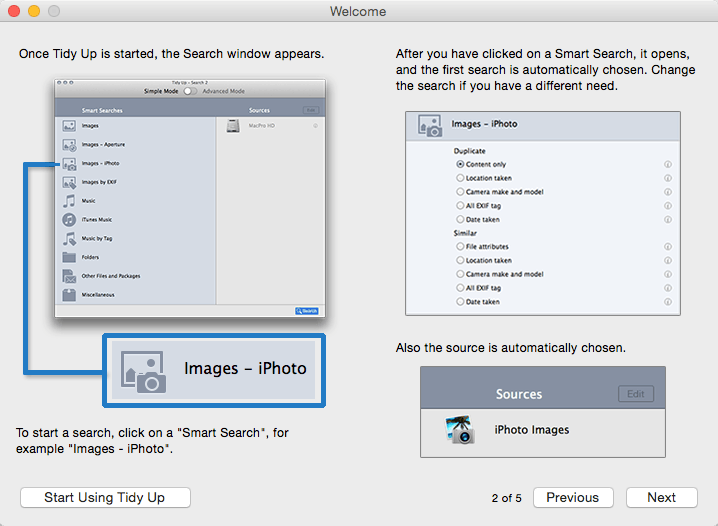 - With Tidy Up you can search for duplicate files and packages by the owner application, content, type, creator, extension, time modified, time created, name, label, visibility, and date/age. You can also search by the tag, duration, and bit installments of MP3 and AAC sound files and EXIF metadata; search the contents of the Photos, iPhoto, Aperture, iTunes, iPod databases, and Mail mailboxes; and synchronize deletions with iPhoto, Mail, and iTunes.