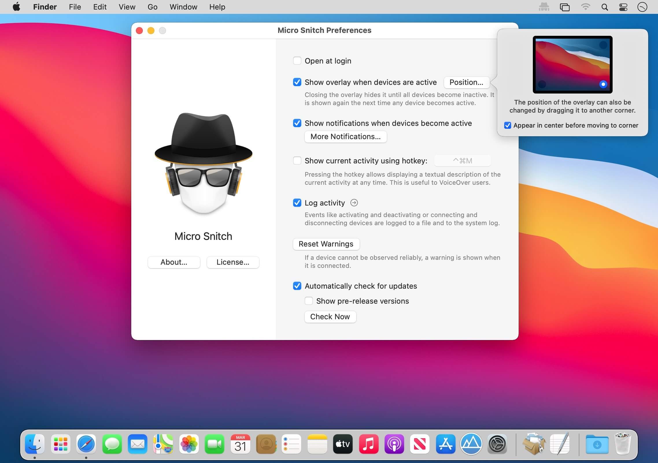 - Overlay -- An on-screen overlay is shown while the microphone or camera is turned on to make sure you won’t miss it even if the menu bar isn’t currently visible.